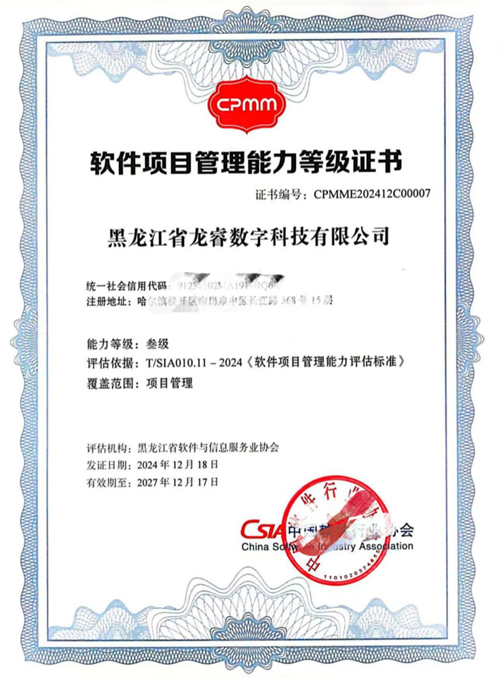 近日,经过黑龙江省软件与信息服务业协会的受理和初评,并由中国软件行业协会组织的专家团队进行严格评审,黑龙江省龙睿数字科技有限公司(以下简称“龙睿数科”)凭借优秀的项目管理能力,荣获软件项目管理能力评估(CPMM)三级证书。这一荣誉的获得,标志着龙睿数科在软件开发和项目管理方面取得了显著成就,并成为黑龙江省首家获得CPMM证书的企业。